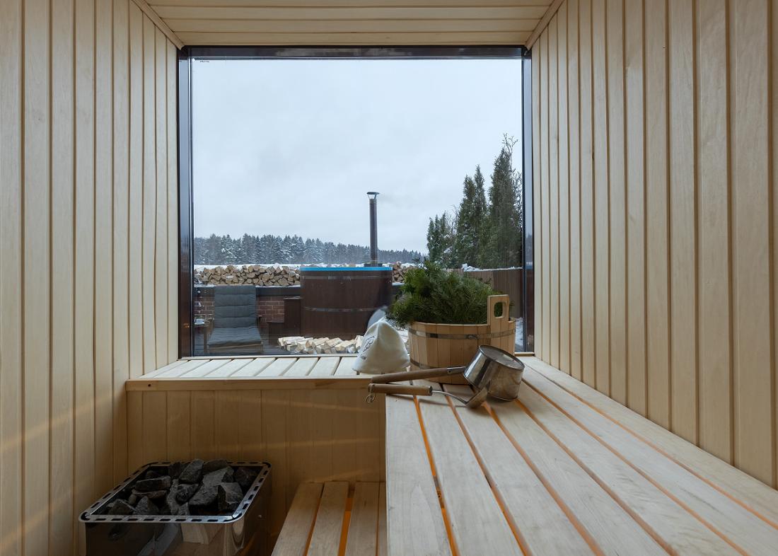 - Индивидуальная финская парная с панорамным остеклением и видом на хвойный лес с высоты 3-го этажа,