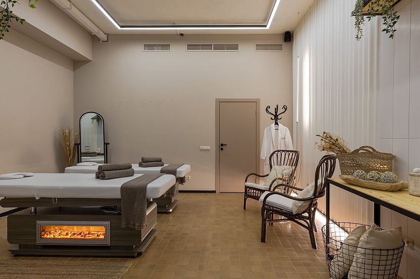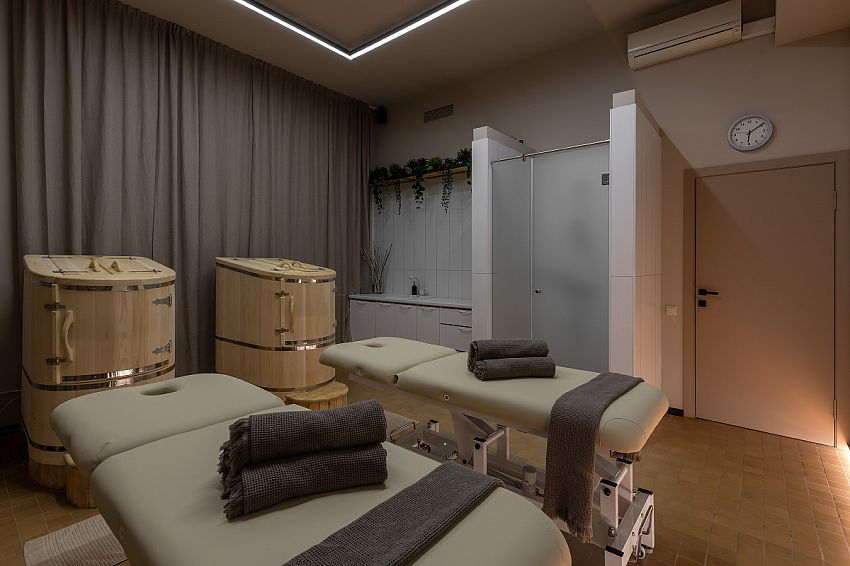 Собственная душевая кабина для комфортного принятия процедур, а также два массажных стола.