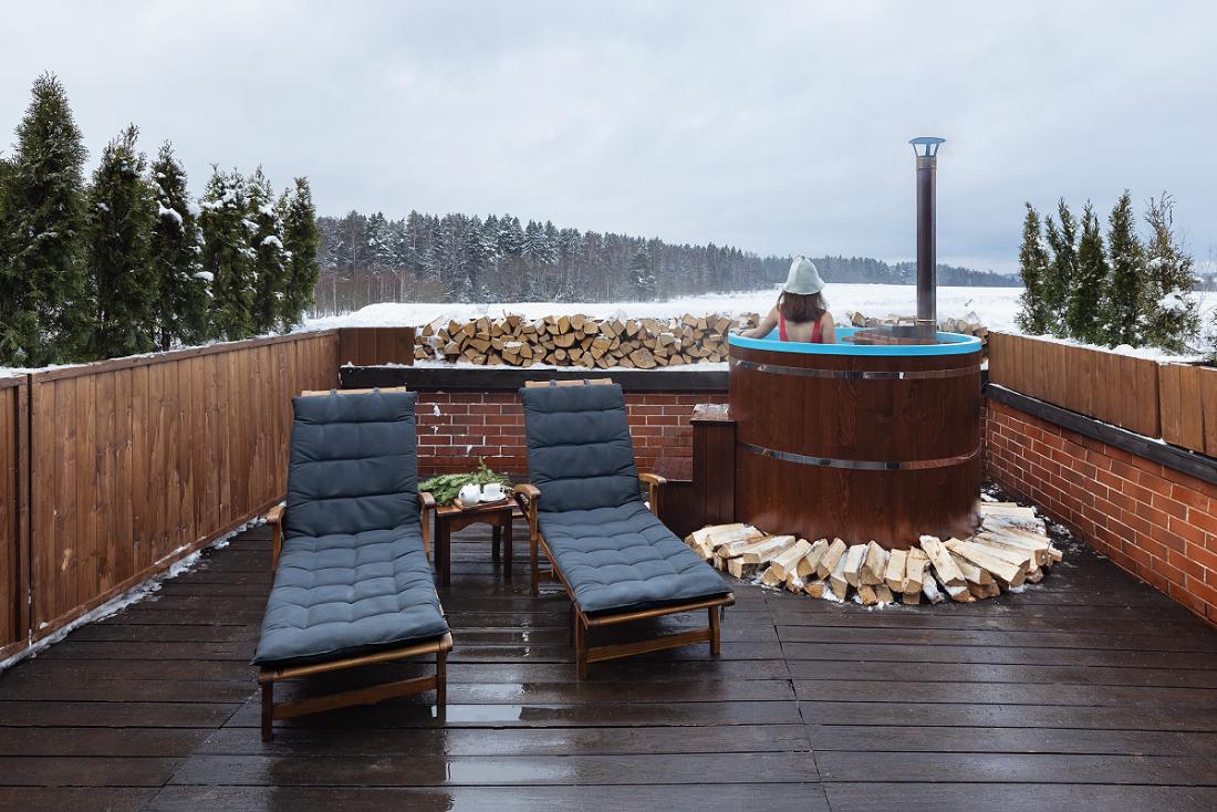 - На 3-м этаже закрытой уличной зоны отдыха расположилась бочка "Фурако" с теплой водой,